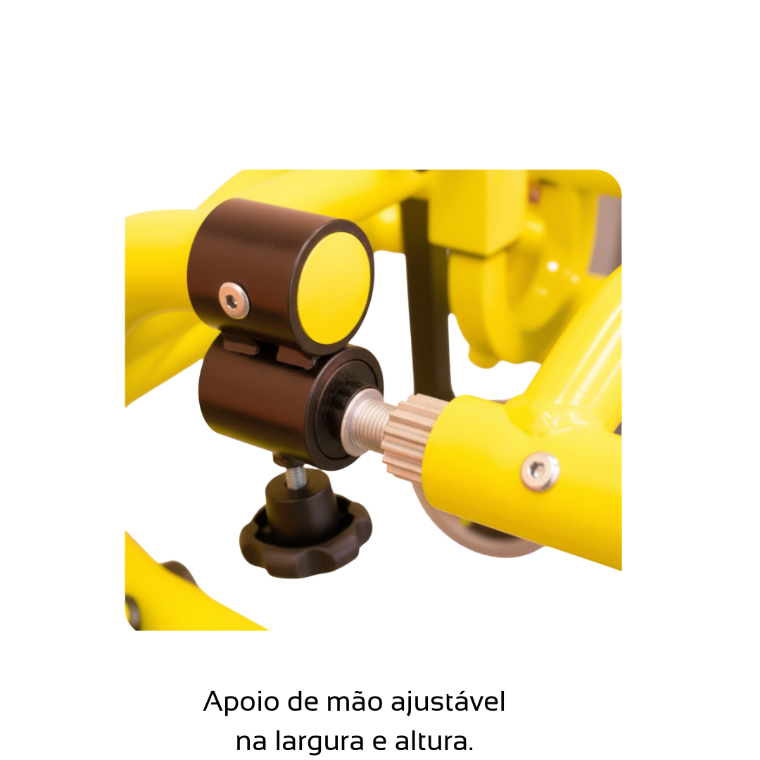 - Apoio de mão com manoplas emborrachadas antiderrapante, com regulagem através de engrenagem que permitem o ajuste na altura e largura em diversos ângulos;