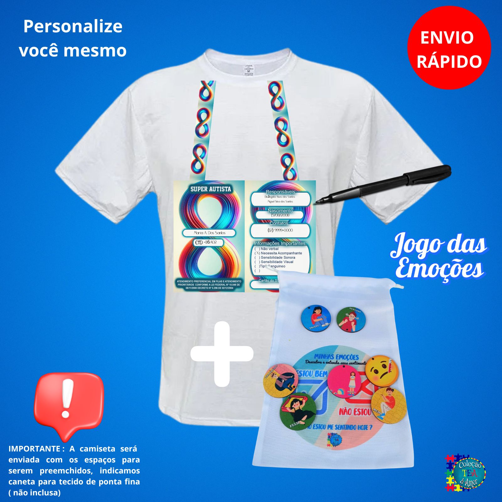 A Camisa Branca com cordão de identificação é especialmente criada para pessoas autistas, oferecendo conforto, proteção e funcionalidade. Produzida em tecido leve e macio, ideal para uso diário, possui uma estampa exclusiva que simula um cordão para preencher informações essenciais como nome, CID e contatos de emergência. Essa personalização feita com caneta permanente garante segurança e facilita o acolhimento em situações externas.
