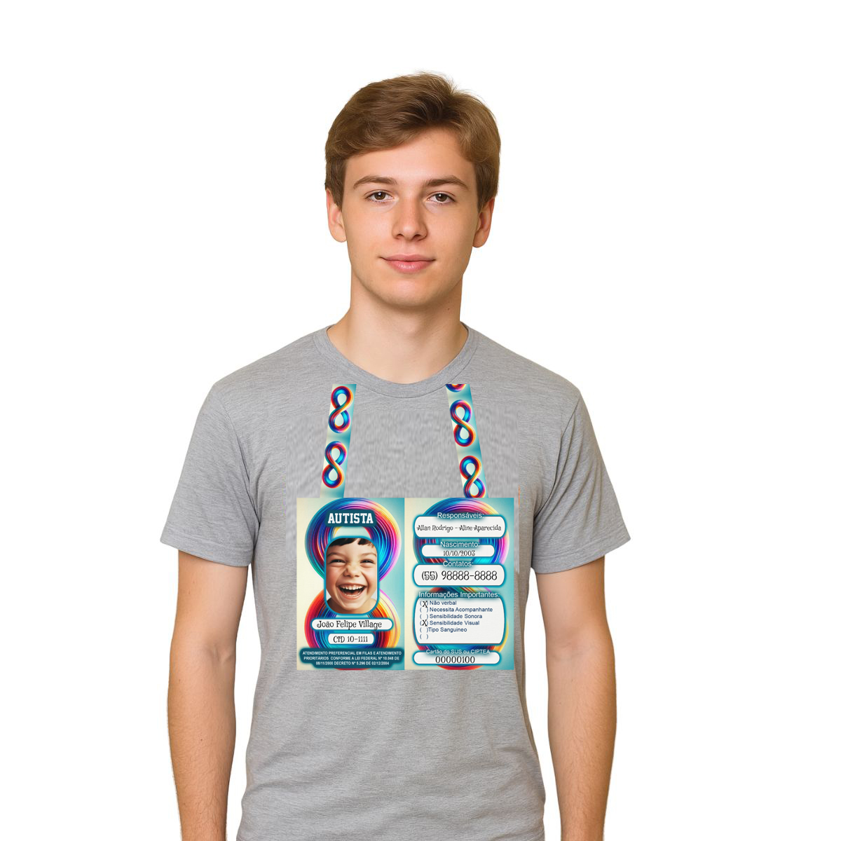 A Camisa Infinity Gray foi criada com amor e propósito para acolher e empoderar pessoas autistas, unindo estilo e funcionalidade. Confeccionada em tecido leve e confortável, é ideal para uso prolongado em diversas situações. Sua estampa frontal personalizada traz informações essenciais, como nome e contatos de emergência, garantindo segurança e tranquilidade. Essa inovação facilita o acolhimento em situações externas e promove proteção eficaz. Produto em poliéster, tamanho único G, cor cinza.