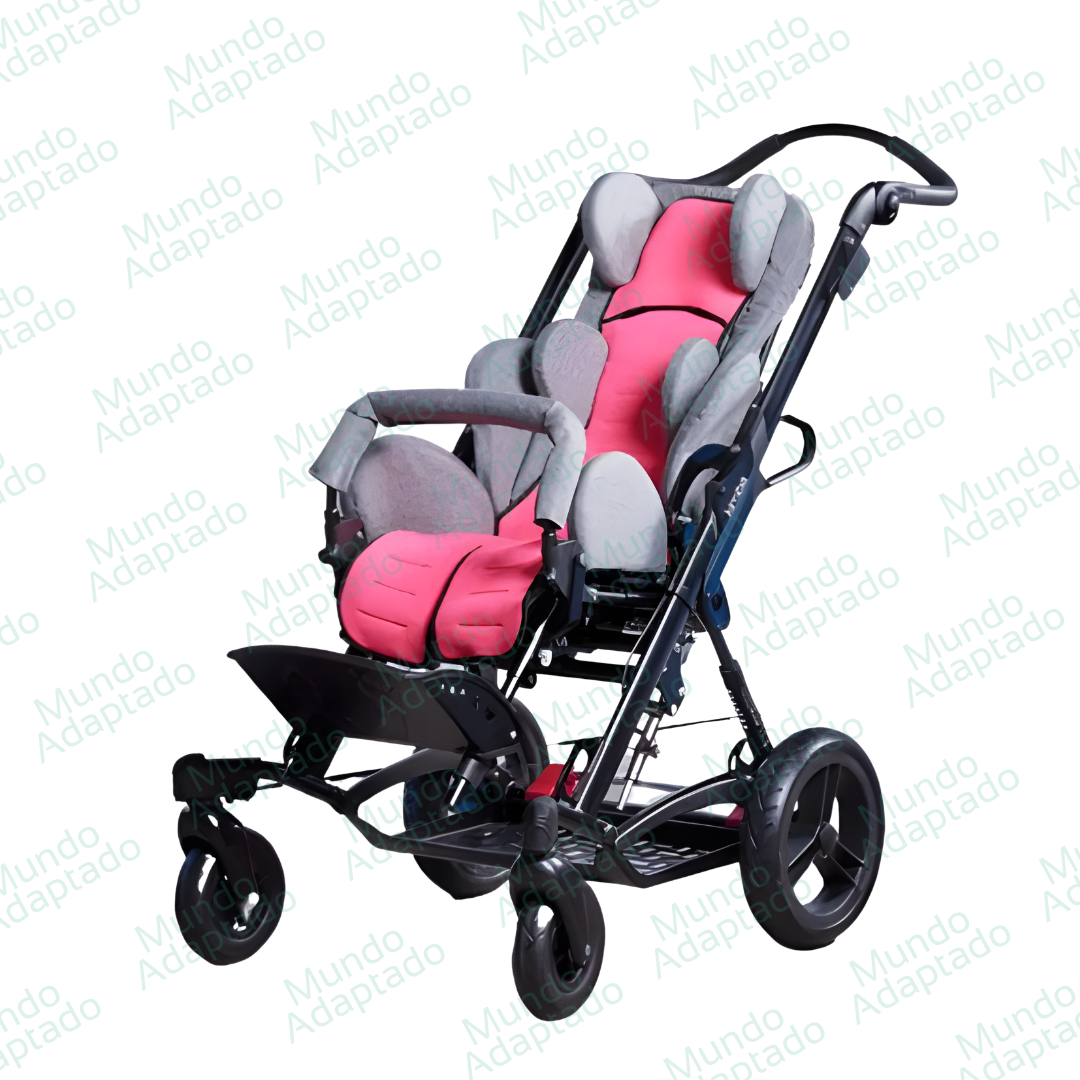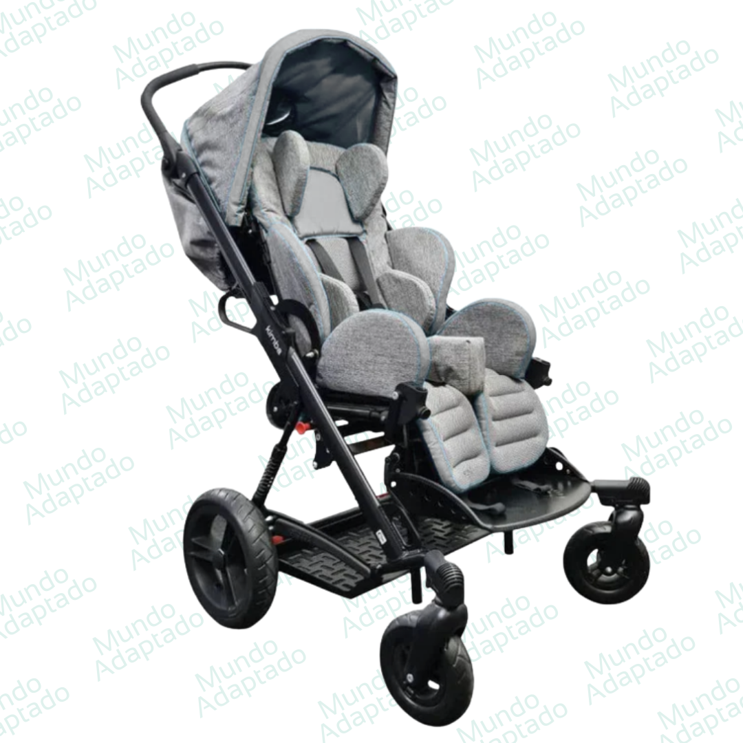 Carrinho Postural Kimba, com chassi dobrável e sistema de suspensão das rodas traseiras ajustáveis;