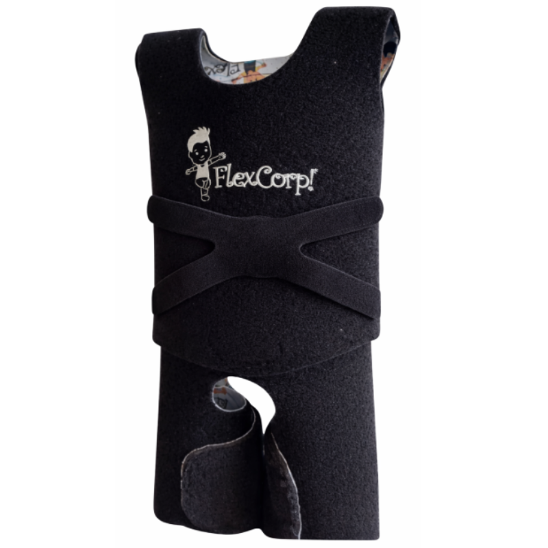 Seu design em formato de macacão acomoda tronco, quadril e coxas de forma segura e delicada, sem sobreposição de material, favorecendo o conforto durante o uso. Possui fechamento frontal, facilitando o vestir e o despir no dia a dia, e permite a utilização de faixas tensionadoras quando houver indicação profissional.
