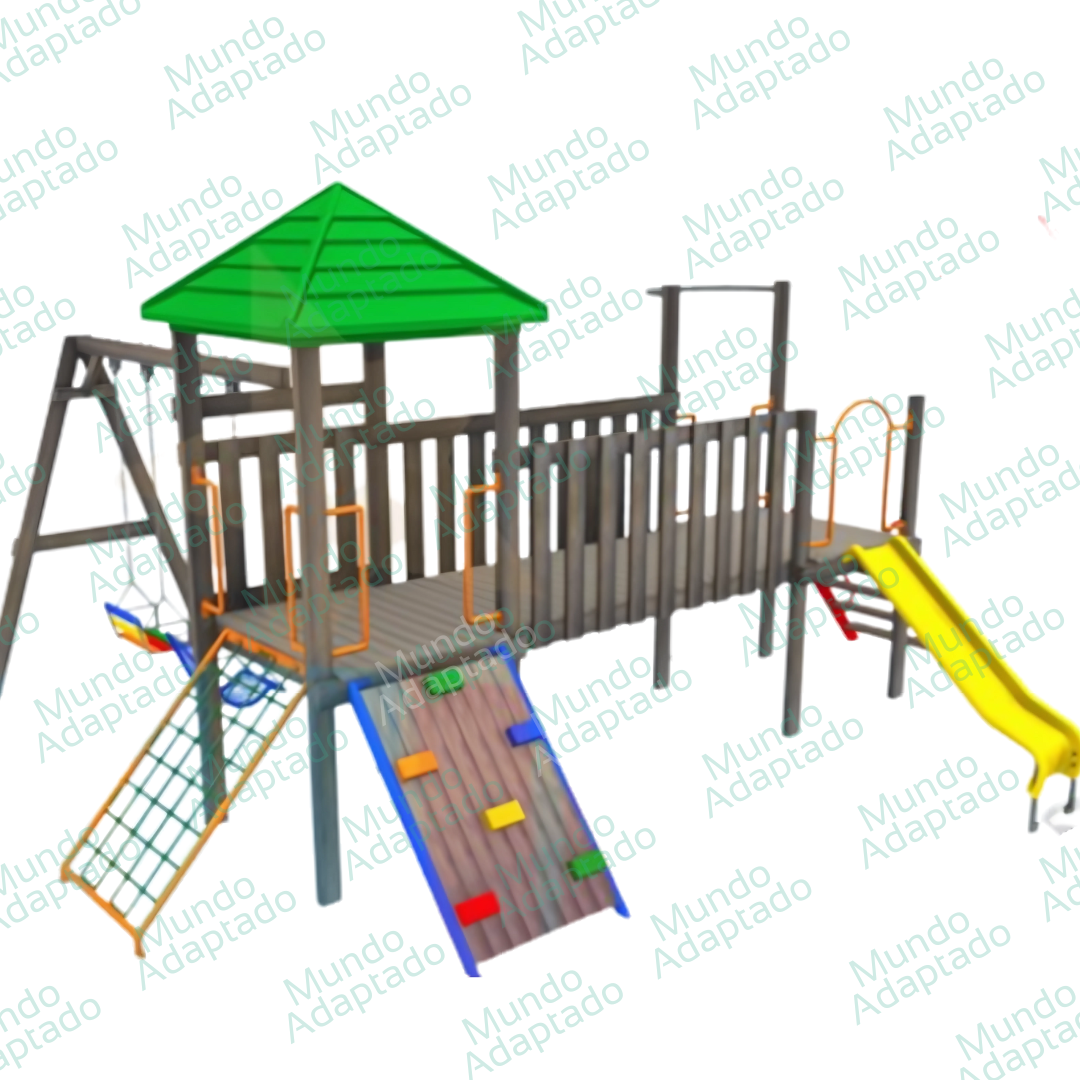 Este playground completo, ideal para até 30 crianças de até 6 anos, oferece 10 atividades divertidas, incluindo torres, balanços, escorregadores e escalada. Feito com estrutura resistente de madeira de lei e fibra, possui um acabamento seguro e durável, com opção de modelo fixo ou móvel para melhor se adaptar ao seu espaço. Perfeito para escolas, condomínios e espaços de lazer.
