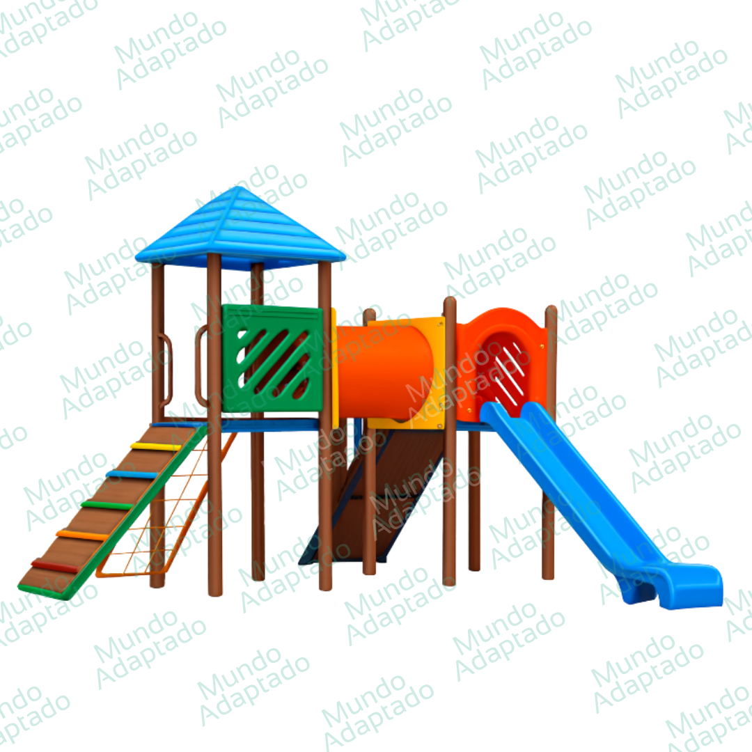 Relatar AbusoParquinho Madeira Plástica – Descrição: madeira plástica nos pés direitos e assoalhos, ferragens galvanizadas, pintura epóxi colorida, fixações com parafusos francês e sextavados com arruelas e porcas travantes, pegadores/apoios e proteções nas entradas e saídas, conjunto com torre com cobertura, torre sem cobertura, tubo horizontal, rampa de escalada, escada, escalada de cordas e escorregador. Capacidade: 15 crianças ou mais. Atividades: 7 atividades. Faixa etária: crianças até 12 anos. Dimensões: 4,00m x 4,30m x 3,20m (L x C x A). Altura do patamar: 1,20m.
